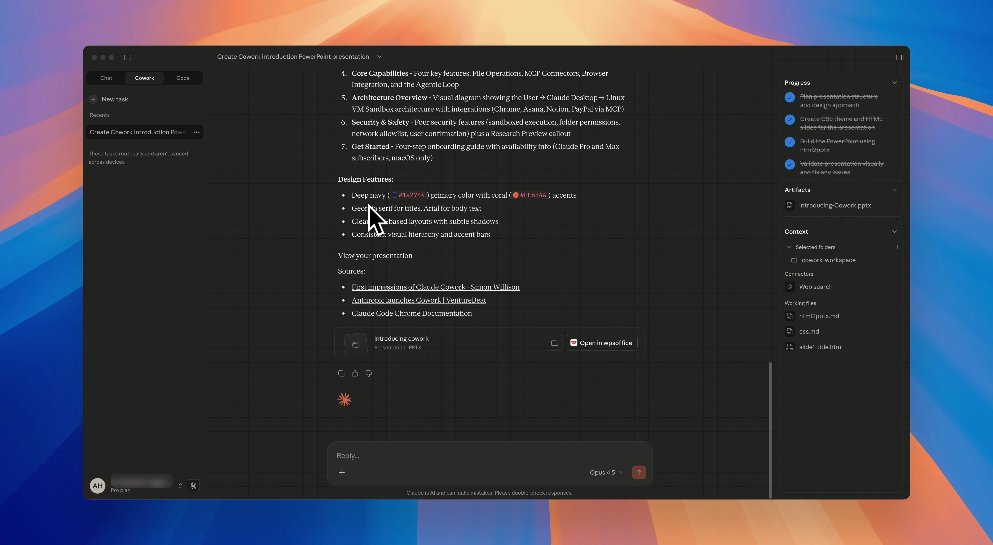 Create a PowerPoint presentation for people unfamiliar with Cowork, introducing its core capabilities, the problems it solves, and its core architecture. Reference: https://claude.com/blog/cowork-research-preview